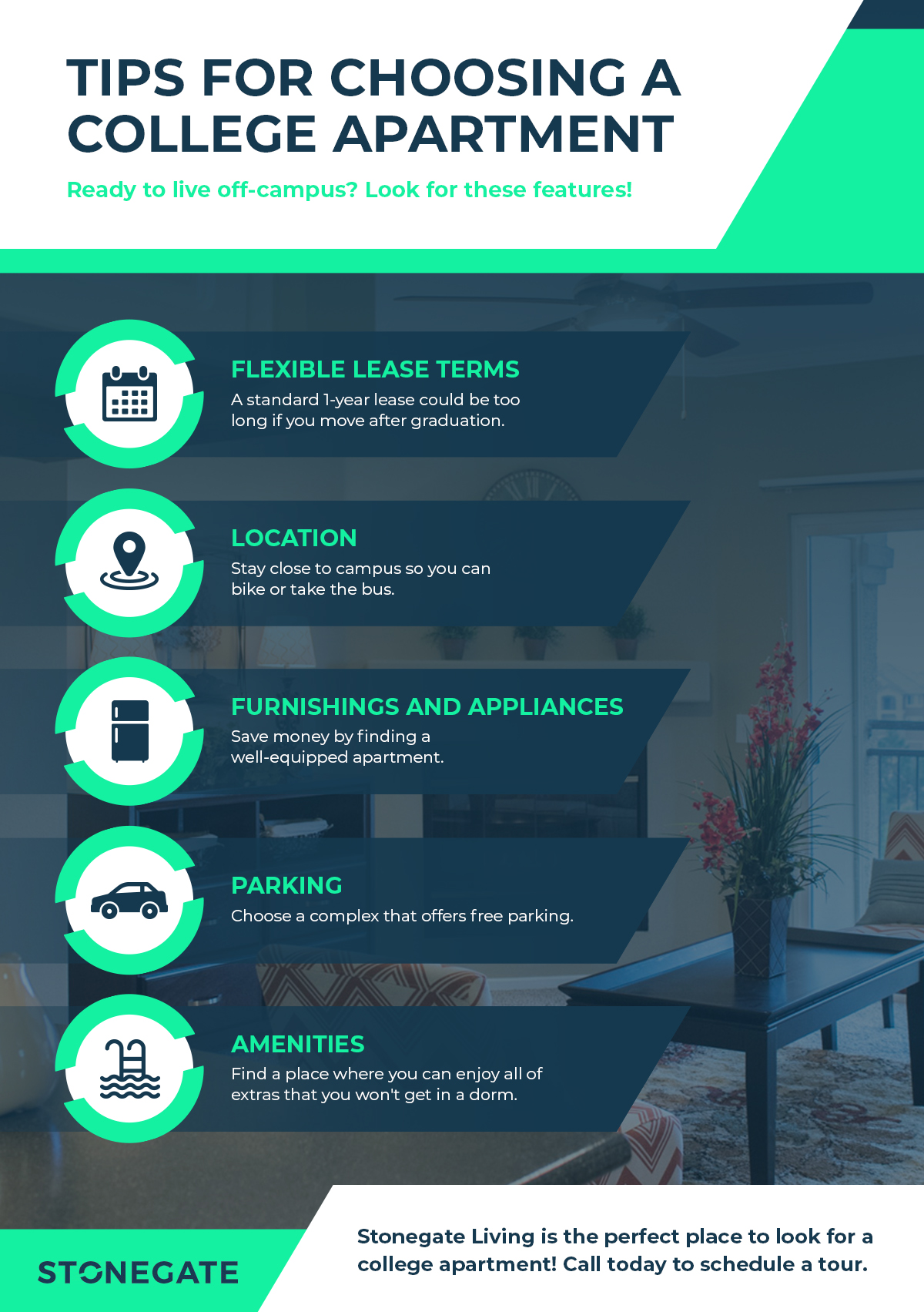 In today’s blog from Stonegate Living apartments in Broomfield, we’re going to provide you with a few tips that will help you make the best choice for your first apartment. Keep reading, and if you’re looking for a pet-friendly community close to Denver and Boulder, we invite you to stop by and check us out.